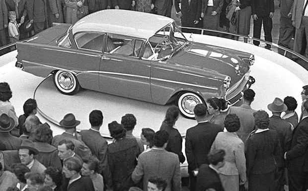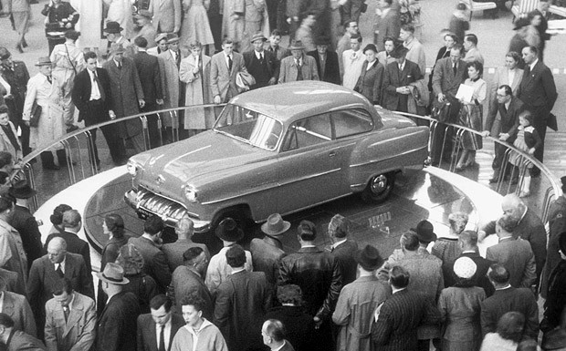 von 7: Wir sind wieder wer: Der schnell wachsende Mittelstand versammelte sich bei der IAA 1957 um den neuen Opel Rekord Olympia. Männer und Frauen trugen noch Hüte und die Autos Panorama-Scheiben.