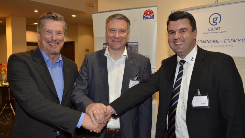 von 16: Gerd Heidemann, MAHA, Jörg Gudat, Gudat Consulting und Axel Krüger, DAT (v.l.) freuten sich über die Bekanntgabe der Kooperation der drei Unternehmen beim Thema FFI auf dem asp Werkstatt-Kongress.