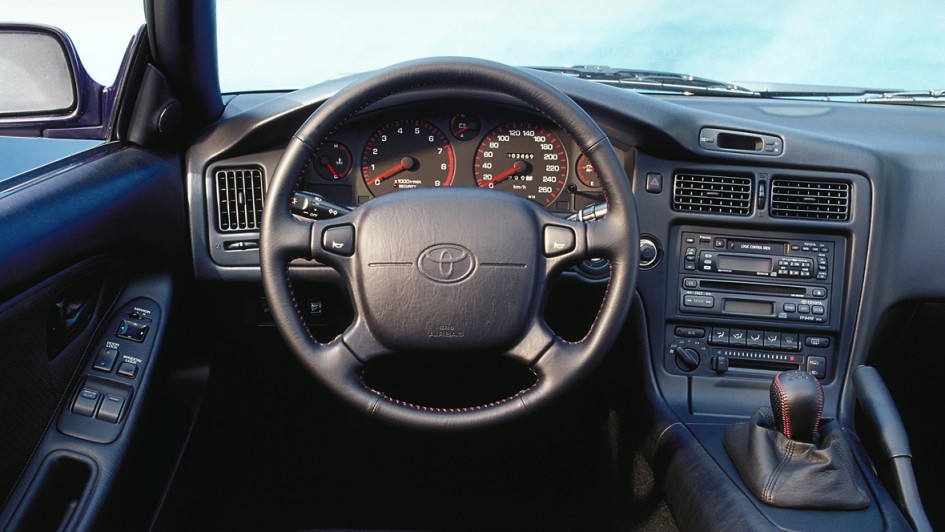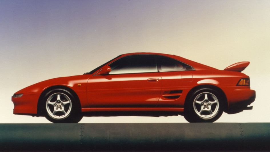 von 9: Hinter den eng geschnittenen Sportsitzen des ansonsten größeren MR2 (W20) fand ein vollkommen neuer, deutlich voluminöserer 2,0-Liter-16-Ventiler Platz, der seine Kraft klassisch auf die Hinterräder übertrug und als "midship-rear" dem zweisitzigen MR2 weiterhin seinen Namen gab.