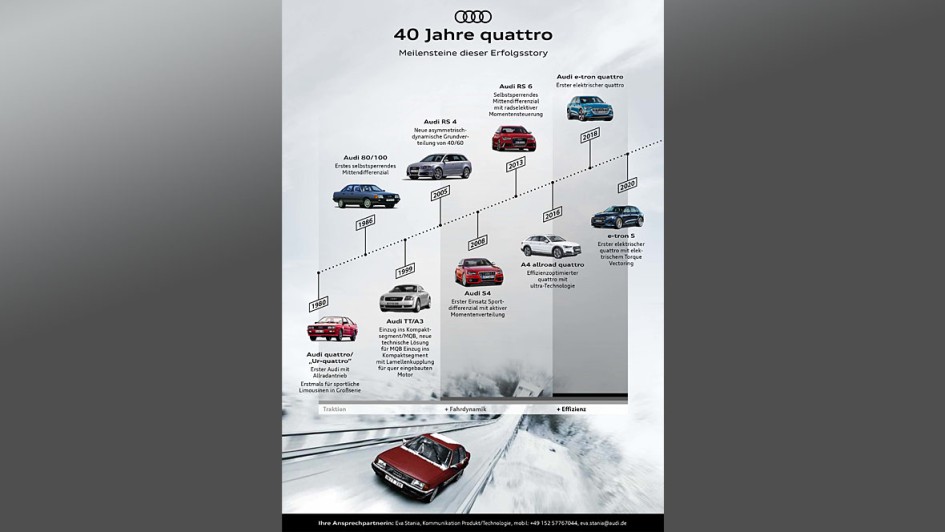 von 14: War Quattro zunächst auf die Verbesserung der Traktion ausgelegt, wurden später Dynamik und Effizienz weitere Entwicklungsschwerpunkte.