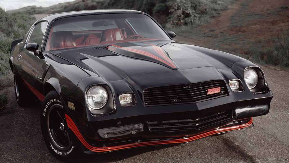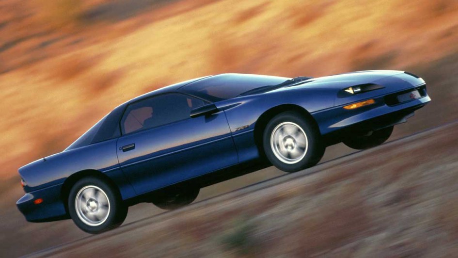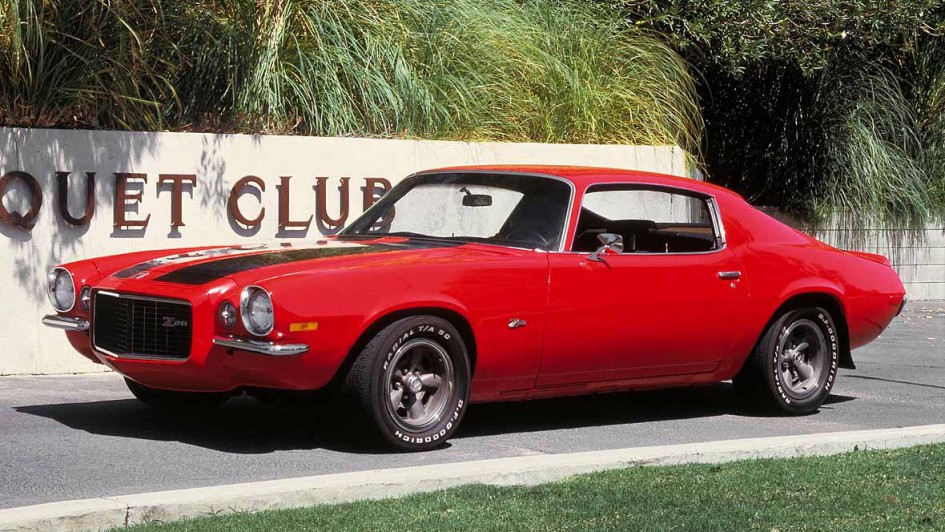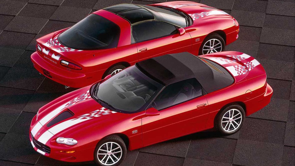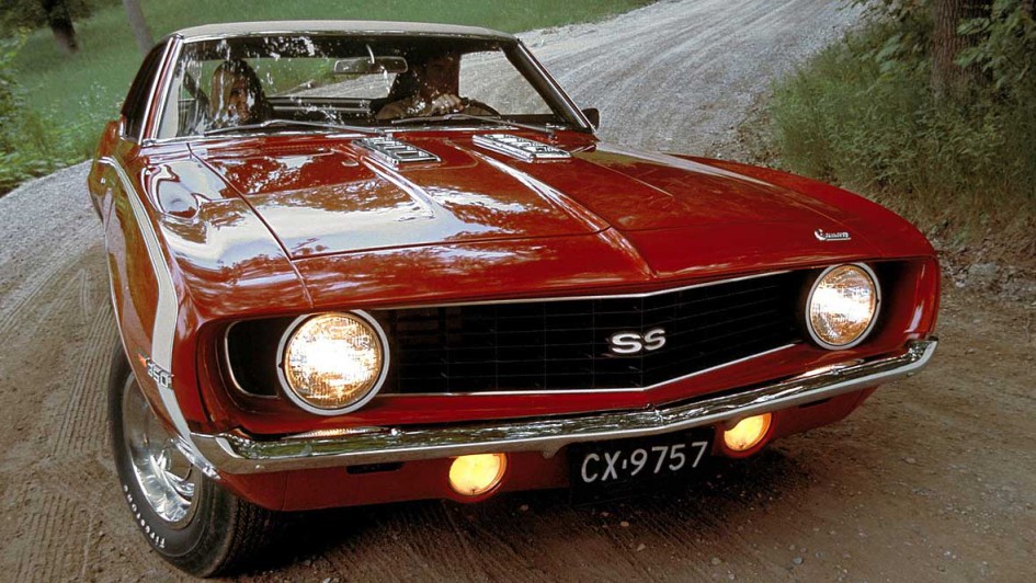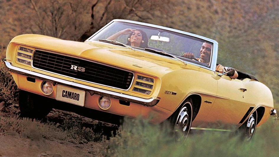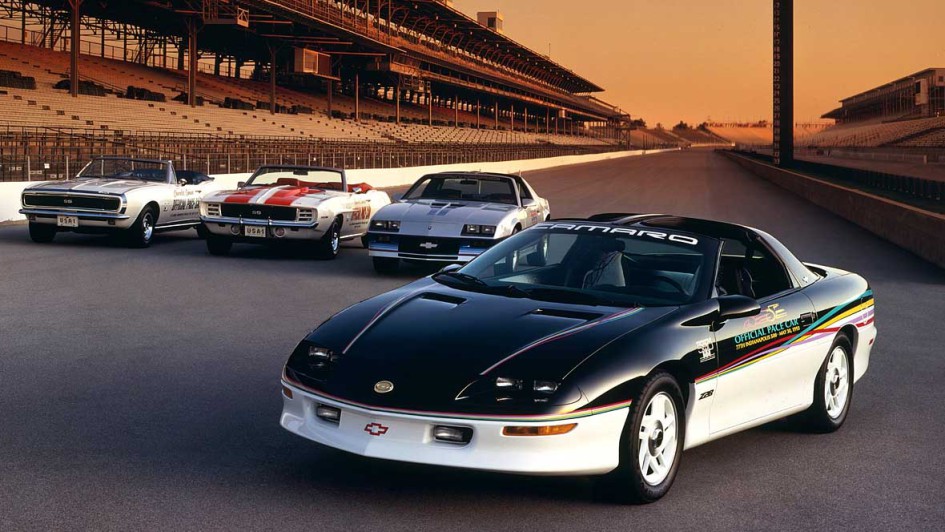 von 20: Chevrolet Camaro Generationentreffen. Vorne Generation 4 als Z28 Modelljahr 1993, daneben Generation 3 als Z28 Modelljahr 1982, daneben Generation 1 als SS Modelljahr 1969, daneben Generation 1 als SS Modelljahr 1967.