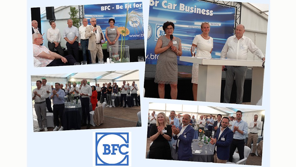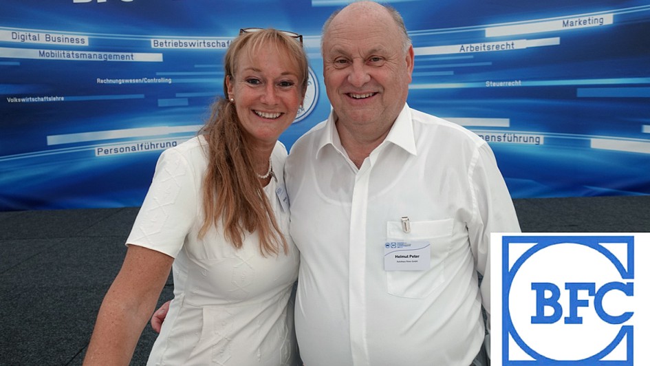 von 17: Mitgestaltet wird die BFC über die Vorstandschaft, die zum besonderen Branchenevent vertreten war über die stellv. Vorstandsvorsitzende Petra Brandl, Geschäftsführerin der Kfz-Innung Augsburg – (re), RA Niklas Burmester, GF des Landesinnungsverbandes Saarland, Helmut Peter, Sylvia Gerl, Anita Friedel-Beitz und Achim Kreyenpoth, Bank Deutsches Kraftfahrzeuggewerbe. Als besonderer Partner der BFC wurde Burkhard Weller begrüßt und sein besonderes Engagement gewürdigt. Im Bild mit Maik Kynast, Generalbevollmächtigter der Santander. Gerl würdigte weitere Partner, die neu im Sponsoring hinzukamen, u. a. die Targobank. Außerdem begrüßte sie als "neue" Gastdozenten Julian Wolters von Auto-Abo Faaren, Frank Fichert von Sales Quality, Dirk Walter von "Cars & Bytes"/mobile.de, der Gerl gerne als Moderatorin einspannt und die BFC mit namhafter Spende versorgt hat. Ferner wurden benannt: Andrea Patzelt von DOAK, die seit Jahren als regelmäßige Gastdozentin aufzeigt, wie man sich richtig bewirbt bis zur regelmäßigen Teilnahme der Studentenschaft an ihren Online-Kongressen.