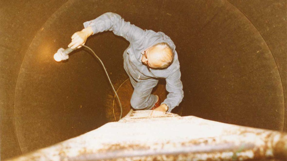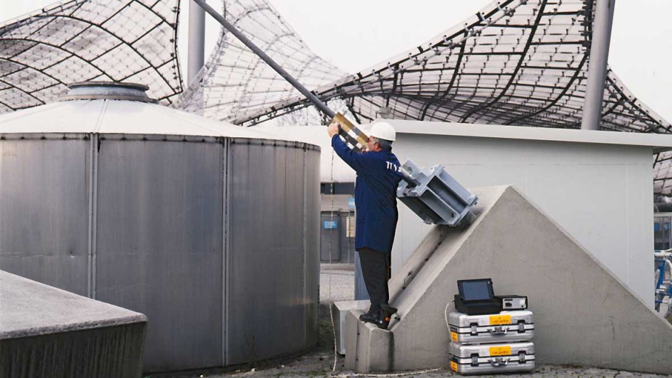 von 19: Anlagensicherheit: Ein Experte der TÜV Bayern-Abteilung für Anlagen- und Werkstofftechnik prüft 1993 die Seite an einem Beleuchtungsmasten des Münchner Olympiastadions.
