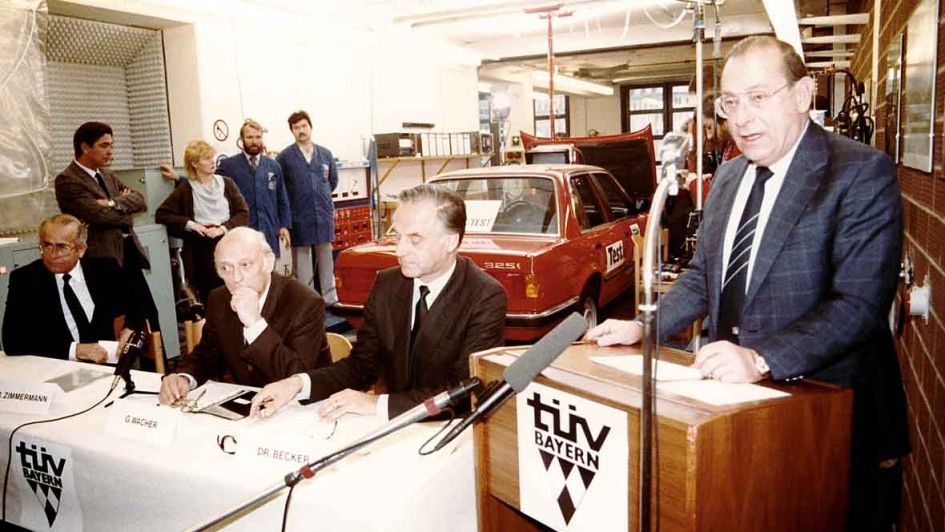 von 19: 1985 - die Abgassonderuntersuchungv ist Pflicht. Die "ASU" ist auch die Folge der Umweltschutz-Diskussionen der 80er-Jahre. In Bayern damals zuständig für das politische Umweltbewusstsein: Umweltminister Friedrich Zimmermann bei einer TÜV-Pressekonferenz anlässlich der Einführung der Abgassonderuntersuchung.