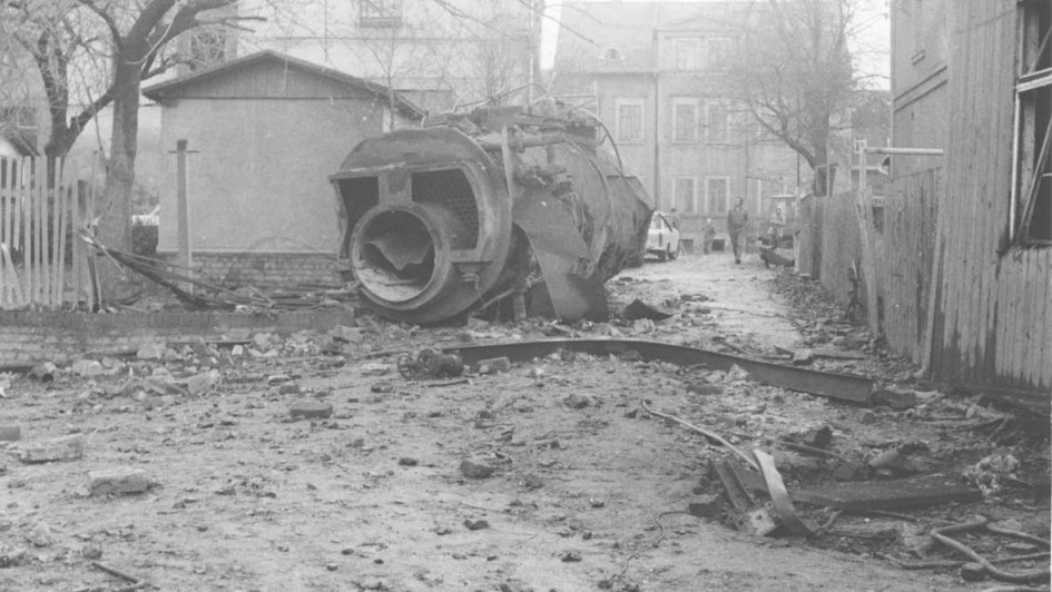 von 19: Zerknall eines Hochdruckkessels in einer Textilfabrik in der damaligen Karl-Marx-Stadt Ende der 1970er-Jahre. Der zehn Tonnen schwere Kessel riss sich aus dem Fundament, durchschlug das Kesselhaus, flog ca. 200 Meter weit und blieb vor einem Mietshaus liegen.