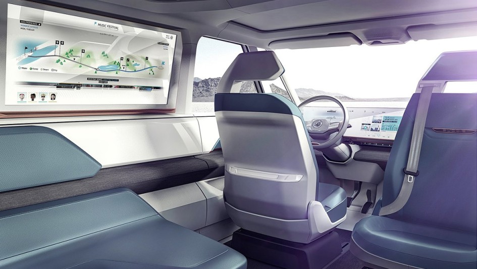 von 15: Jeder Fahrgast kann zu Hause in einer App seine Lieblingsmusik auswählen, im BUDD-e werden diese Playlisten dann zusammengeführt und über einen 34 Zoll großen Bildschirm angesteuert.