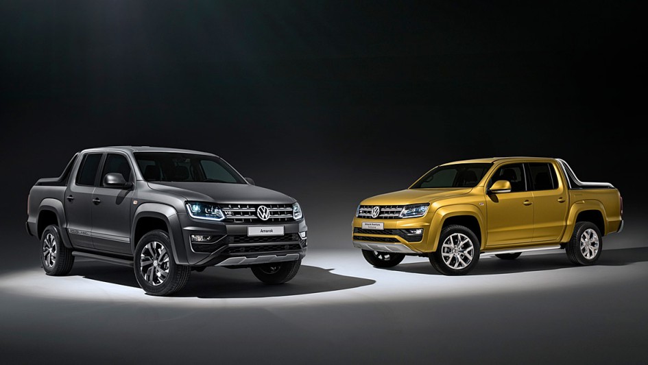 von 8: Der VW Amarok stellt sich als luxuriöses Konzeptfahrzeug Aventura Exclusive und als das mit dunklen Anbauteilen verzierte Sondermodell Dark Label vor.