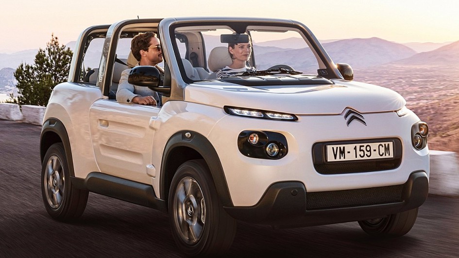 von 14: Nach dem Vorbild des kultigen Strand-Buggy Mehari hat Citroen eine elektrische Neuauflage geformt, die die Franzosen nun in einer alltagstauglichen Variante nicht nur mit Softtop (25.270 Euro), sondern auch mit richtigem Dach (26.470 Euro, Foto) anbieten.
