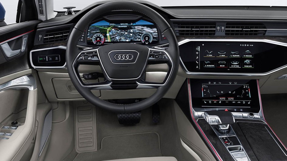 von 15: Neben der inzwischen üblichen Assistenten-Armada, die beim A6 in die beiden separat zu bestellenden Pakete "Stadt" und "Tour" aufgedröselt ist, wird der Technikreigen auch um Luftfederung – als Krönung der vier Fahrwerksoptionen – und Allradlenkung ergänzt.