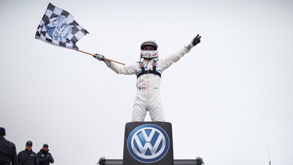 von 9: Fahrer der 1,2 Meter flachen Flunder war der Franzose Romain Dumas. Mit einer Bestzeit von 7 Minuten und 57,148 Sekunden hatte er allen Grund zur Freude.
