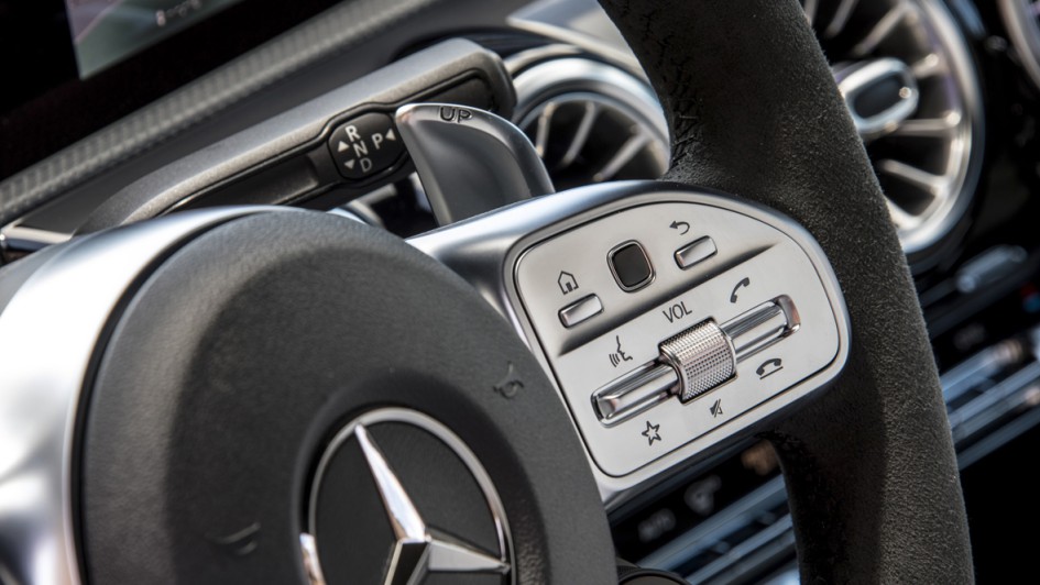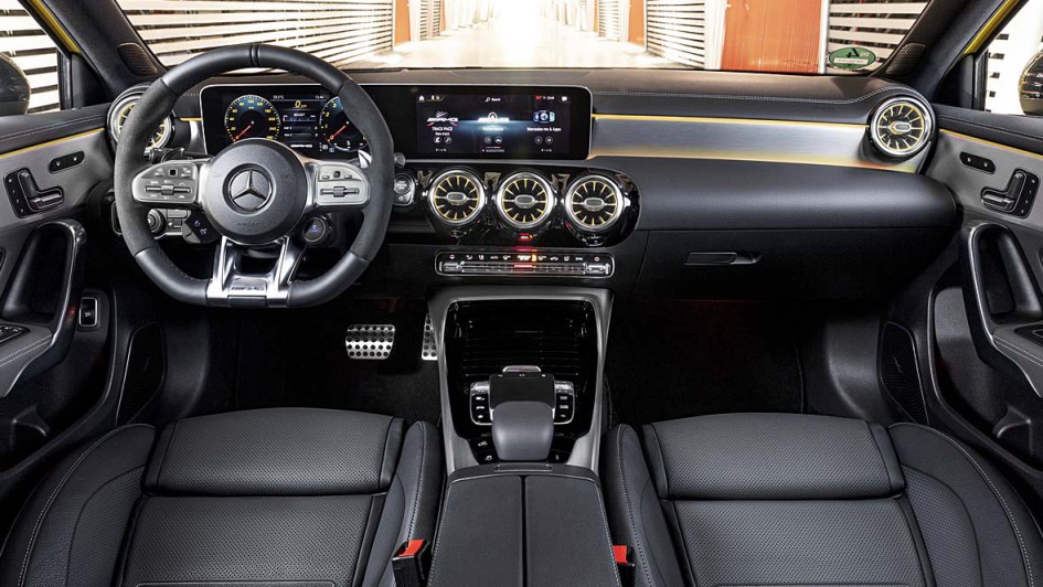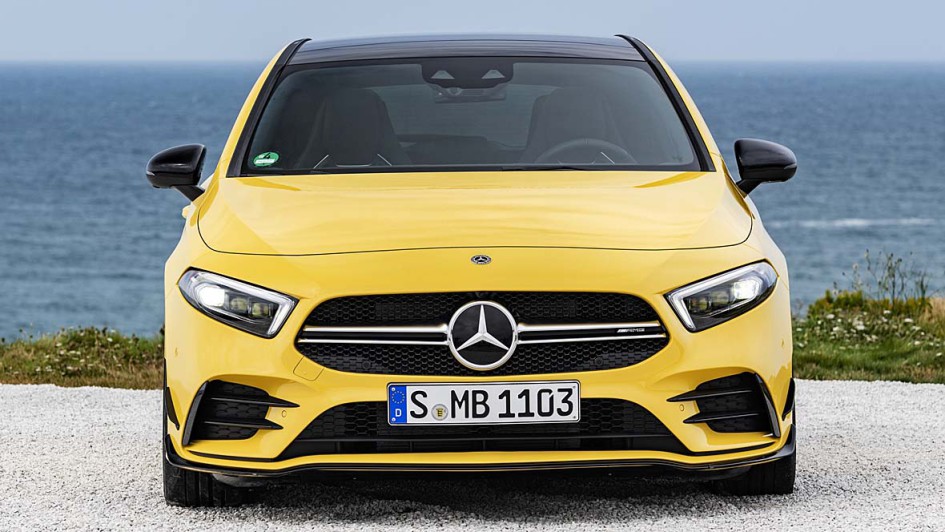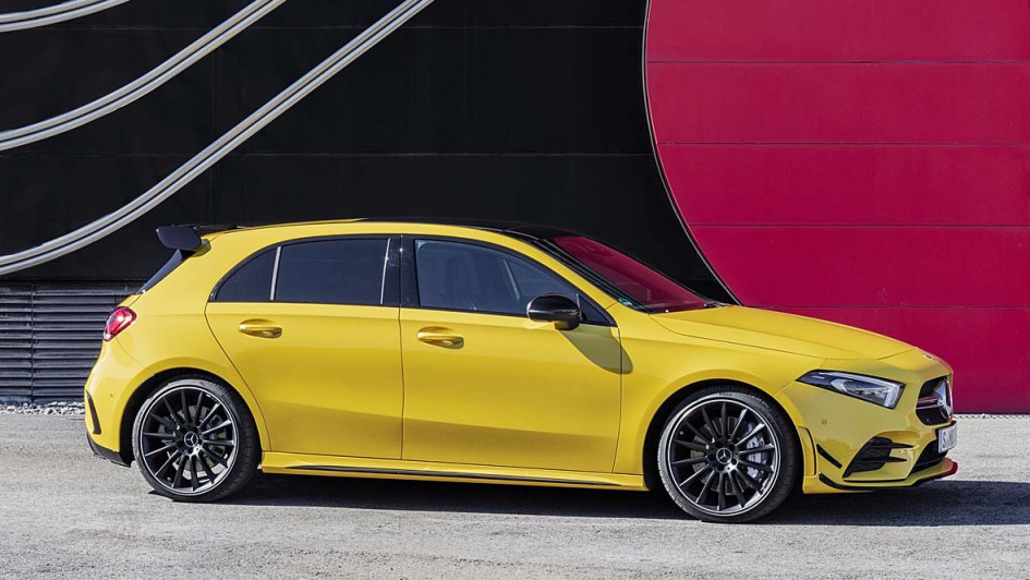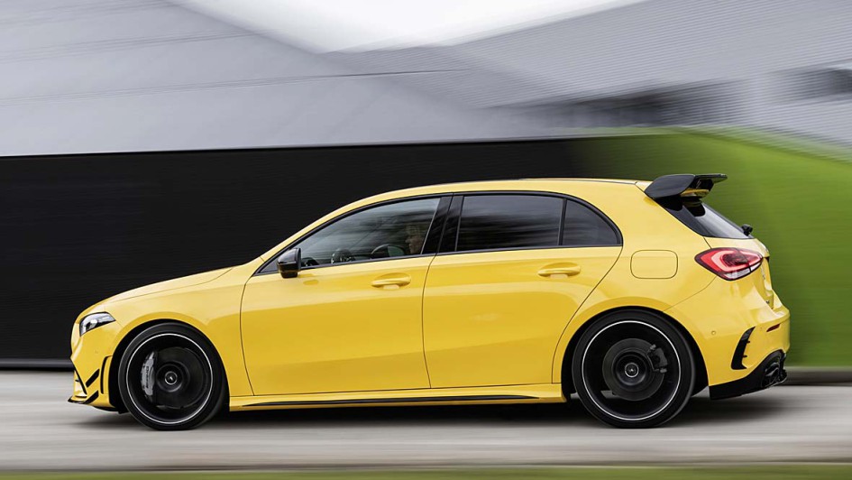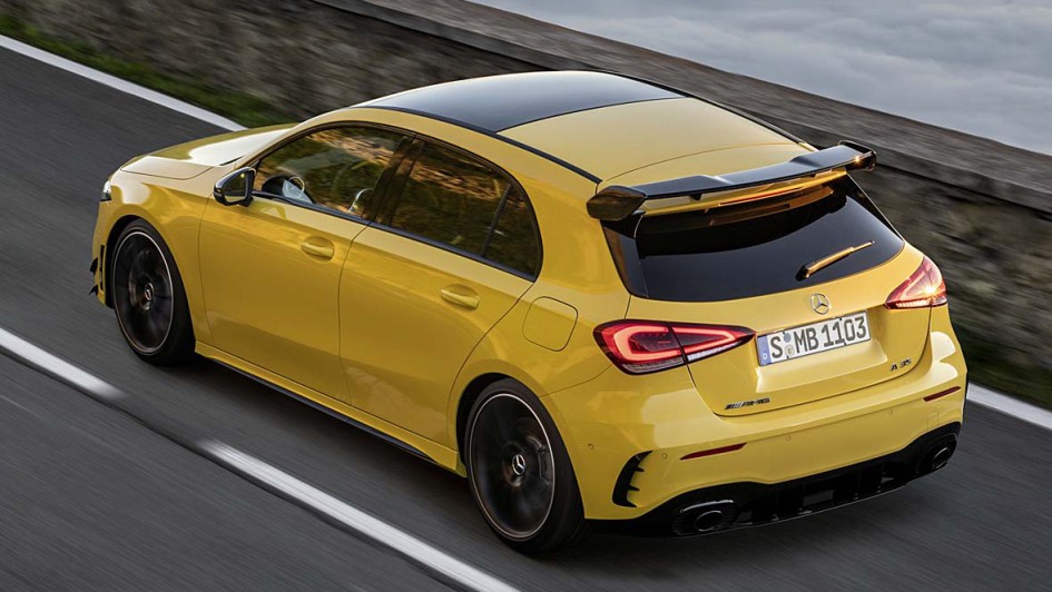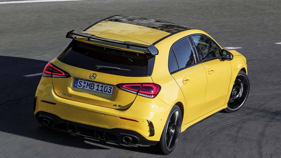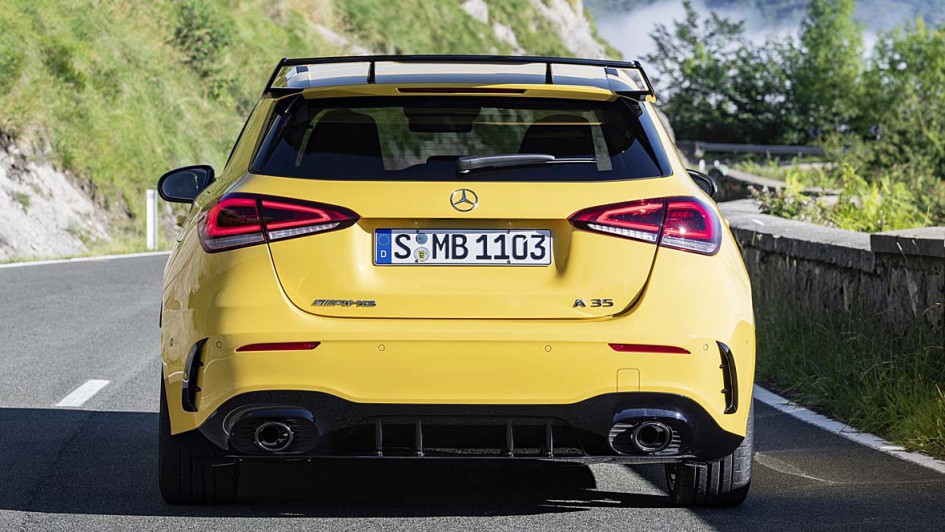 von 11: 4,7 Sekunden soll der Standardsprint mit dem A 35 4Matic dauern. Hinten grüßt in der Basis-Variante ein schmaler Heckspoiler an der Dachkante die Überholten. Wer diese Anpresshilfe als zu schmächtig empfindet, kann ein größeres, freistehendes "Bügelbrett" - hier im Bild - im Aerodynamik-Paket mitbestellen.