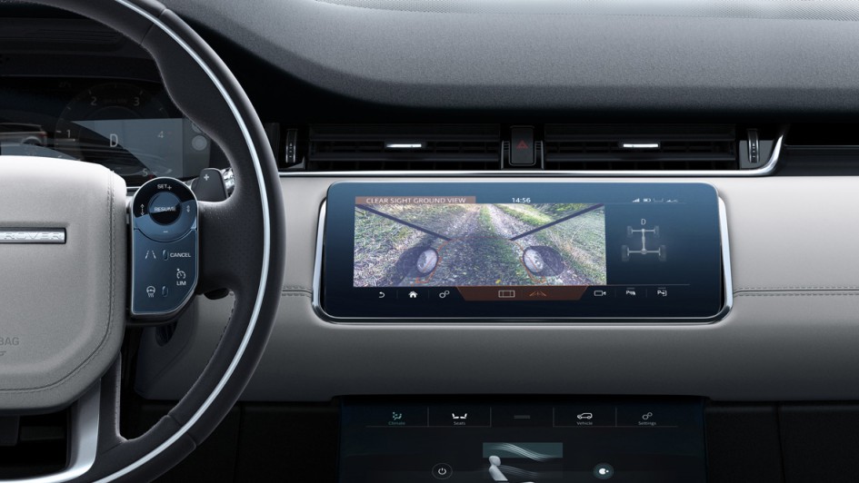 von 9: Das Cockpit zeigt sich aufgeräumt und elegant. Ein spezielles Kamerasystem erlaubt den Blick unter den Vorderwagen - das soll im Gelände, aber auch beim Einparken helfen.