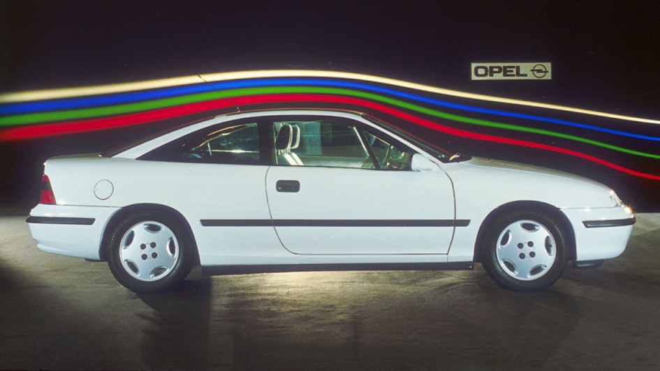 von 13: Für Sportwagen-Feeling sorgte Opel mit dem Calibra. Das Coupé wurde von Herbst 1989 bis Mitte 1997 produziert. Dei schnittige Form sorgte für einen cw-Wert von 0,26, der den Calibra zum "Aerodynamik-Weltmeister" unter den Serienfahrzeugen machte.