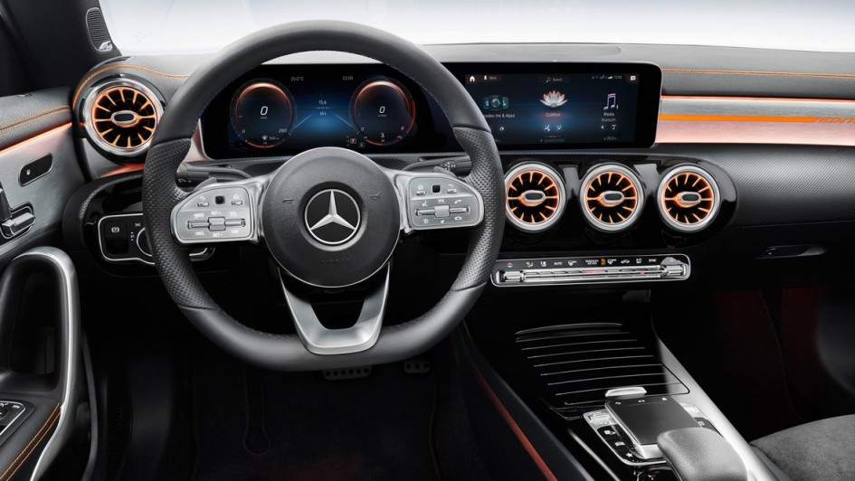 von 10: Das Interieur präsentiert sich im Vergleich zum Vorgänger deutlich modernisiert. Unter anderem kommt hier der 2018 mit dem Neustart der A-Klasse eingeführte, riesige Doppelbildschirm ohne Hutze zum Einsatz.