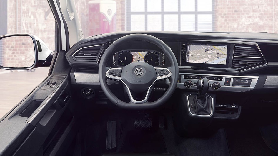von 13: Das 10,25 Zoll breite digitale Cockpit aus den PKW-Modellen informiert nun auch im großen, nach wie vor eckigen VW. Daneben ein bis zu acht Zoll großer Monitor für Navigation und Unterhaltung.