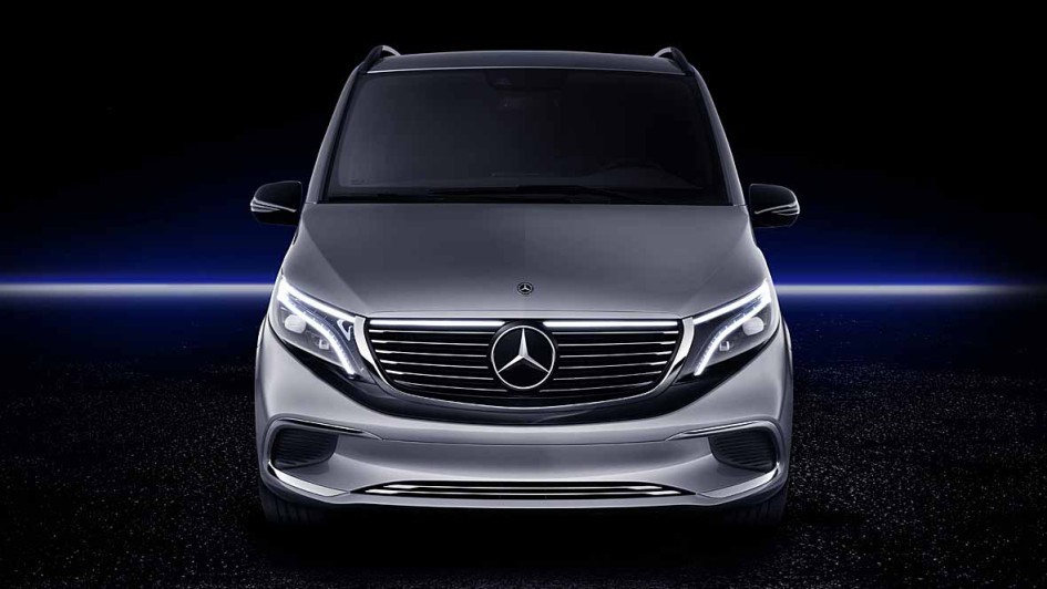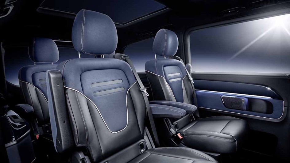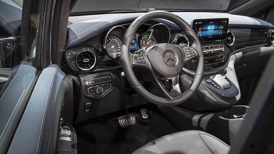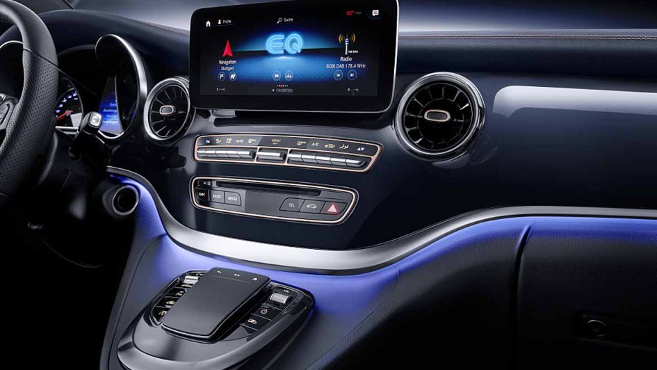 von 9: Das inzwischen in mehreren Pkw-Modellen eingeführte Infotainment-System MBUX mit den großflächigen Monitoren an Stelle von klassischen Armaturen erobert die V-Klasse erst mit der Elektroversion.