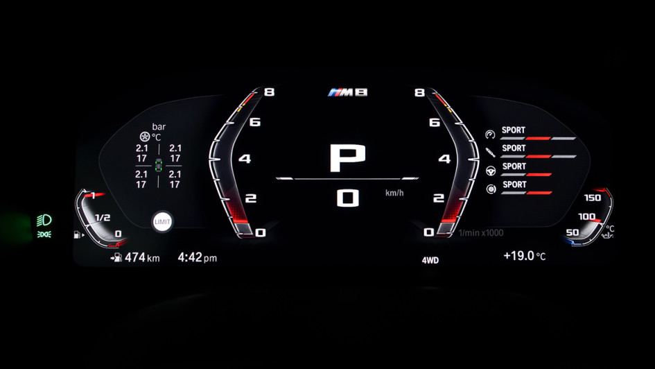 von 9: Das M8 Coupé und Cabrio sowie die jeweiligen Competition-Modelle verfügen über ein neues Anzeige- und Bediensystem. Hierüber lassen sich in nur einem Bedienschritt neben den traditionellen Konfigurationsmöglichkeiten für Motor, Fahrwerk, Lenkung, Bremse und Allradantrieb auch erstmals die Bremscharakteristik individualisieren.