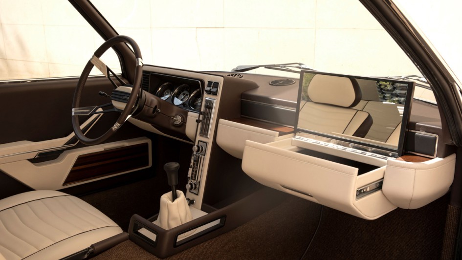 von 7: Der Innenraum verblüfft mit einer extravaganten Kombination von Farben und Materialien sowie einiger ungewöhnlichen Details. Dazu gehört ein XXL-Schminkspiegel auf der Beifahrerseite, der aufgeklappt auf den ersten Blick an einen modernen Riesen-Touchscreen erinnert.
