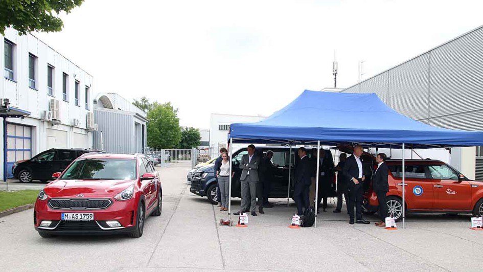 von 7: Patrick Fruth, CEO Division Mobility bei TÜV SÜD, Dr. Houssem Abdellatif, Leiter Automatisiertes Fahren und Fahrerassistenzsysteme bei TÜV SÜD Mobility, Alexander Kraus, Senior Vice President, Global Head of Automotive von TÜV SÜD Division Mobility, Gerhard Müller, Leiter Politik und Wirtschaft in der Division Mobility bei TÜV SÜD und Axel Bischopink, Geschäftsführer der TÜV SÜD Auto Plus GmbH (v. l.)