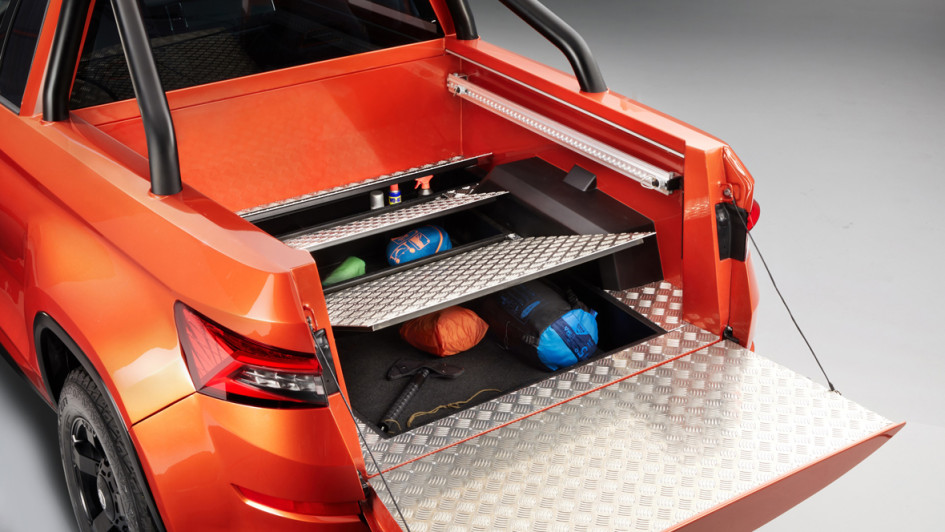 von 5: Die offene Ladefläche wurde mit Riffelblechen ausgekleidet, außerdem gibt es im Unterboden zusätzliche Staufächer und an den Seitenwänden LED-Beleuchtungen sowie Arretierschienen.