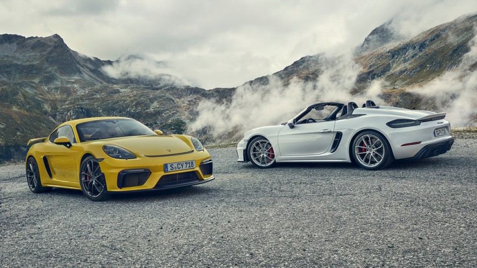 von 9: Porsche krönt seinen Einstiegsbaureihe 718 (Cayman/Boxster) mit einem puristischen Top-Modell. Bei der GT4-Variante von Spyder und Cayman-Coupé ersetzt ein 4,0-Liter-Sechszylinder ohne Turbo den im Standardmodell eingesetzten aufgeladenen Vierzylindermotor.