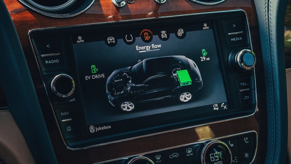 von 8: Der Akku lässt sich während der Fahrt nicht nachladen. Klar kann auch Bentley rekuperieren und die Bremsenergie in Strom umwandeln. Aber den Benziner etwas höher drehen zu lassen, um nebenbei ein bisschen Strom zu bunkern, das haben sich die Briten verkniffen.