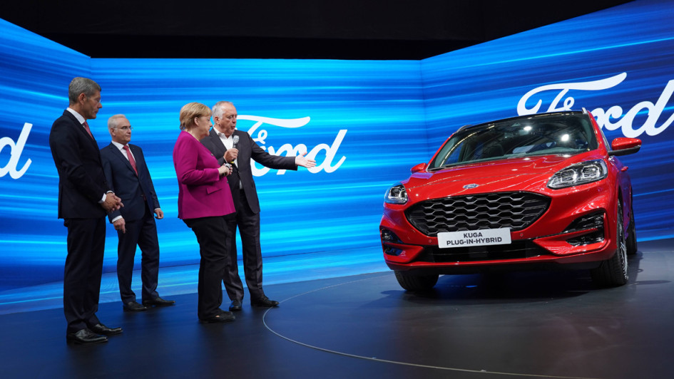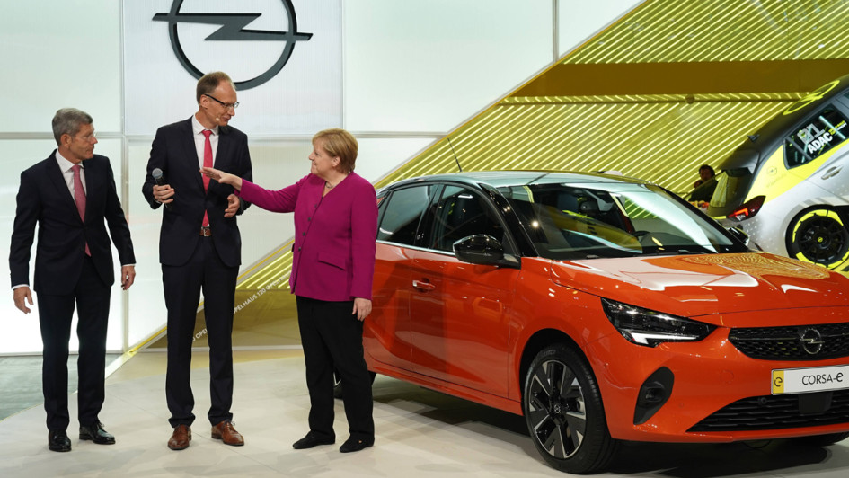 von 12: Auch Opel besetzt auf der IAA das Thema Elektromobilität. Opel-Chef Michael Lohscheller (M.) präsentierte der Kanzlerin den neuen Corsa-e.
