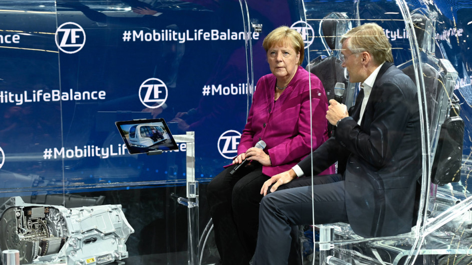 von 12: Auch die Zulieferer wollen der Kanzlerin zeigen, was sie beisteuern zur Mobilität der Zukunft. Ob denn angedacht sei, die Dächer autonomer Shuttle-Busse mit Solarpaneelen auszustatten? ZF-Chef Wolf-Henning Scheider musste zugeben, dass der Energiegewinn daraus lediglich für die Klimaanlage reichen würde.