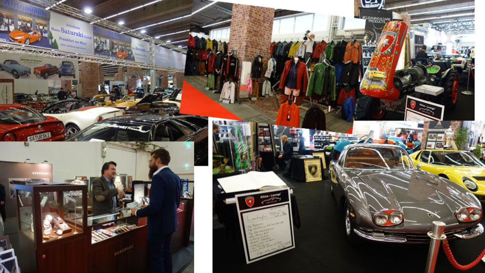 von 46: Für Lamborghini, nicht nur als Auto, sondern als Traktor mit handbemalter Motorhaube werden 222.000 Euro abgegriffen und als 400 GT 620.000 Dollar. Es geht weiter zur passenden Bekleidung und der richtigen Uhr. Nachdem man automobilistisch auf der Messe von Borgward nichts hört, tickt zumindest die Borgward-Uhr am Arm.