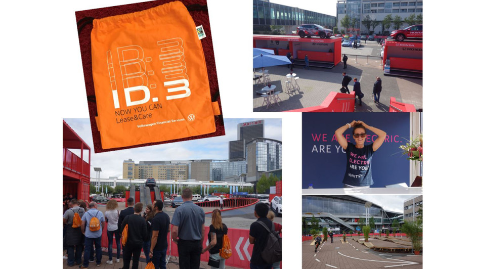Schon früh um 9:30 Uhr standen Interessenten am IAA Offroad Parcours an. Nicht nur Händchen haltend. Sie trugen den orangefarbenen gestylten "Rucksack" von VW Financial Services mit sich, der an den Eingängen zur IAA mit Marschverpflegung verteilt wurde. Welch ein sympathischer Werbeträger. Im Verbund – sichtbar – mit dem ID.3.