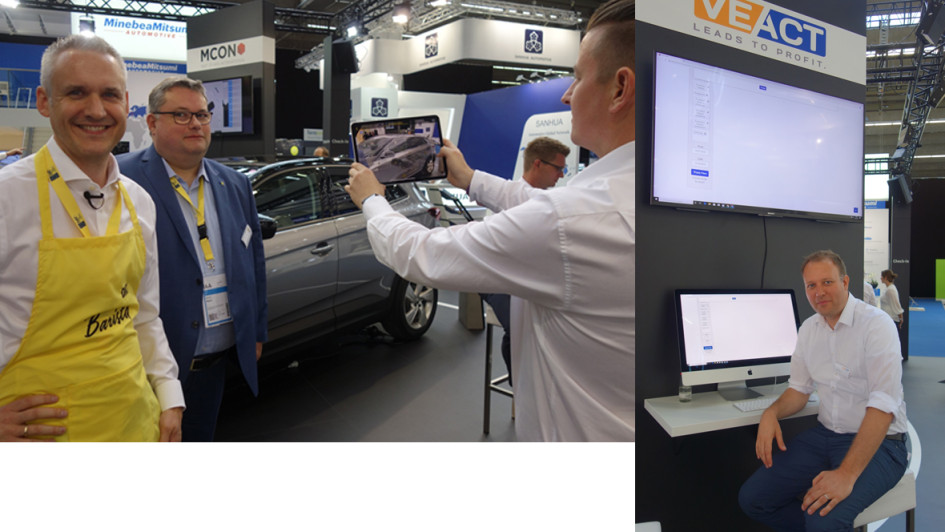 von 46: Die Unternehmenskommunikatoren der DAT, Dr. Martin Endlein und Bernd Reich, erläuterten uns die Customer Journey in neuer Dimension. Dazu hat die DAT sechs innovative Einzelsysteme zu CARDESS verknüpft. Dazu gehören die Kooperationspartner Advectus Solution, CitNow, Dassault Systems 3DEXCITE, MCON Germany, MSX International sowie Veact. Diese präsentierten sich auf dem DAT-Stand. Philipp Posselt von VEACT zeigte uns, wie man die Effizienz der Datenquellen erhöht.