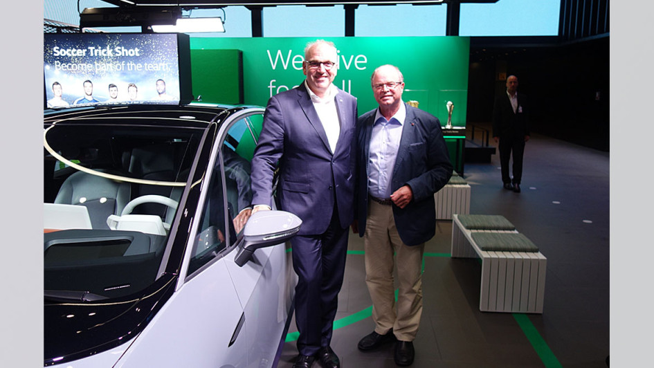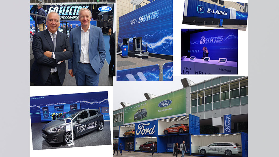 von 46: Ford legte 2019 einen auffällig ansprechenden, großzügig ausgelegten Stand vor. Muss wohl an der Verbindung des VDA-Präsidenten Mattes zu seiner "alten Heimat" liegen. Auf dem Ford-Stand trafen wir Deutschland-ChefHans-Jörg Klein (r.) mit seinem Vorgänger Gunnar Herrmann. Auch Ford setzt sichtbar auf E-Mobilität – mit Ladestationen, Hybridantrieben und im Freien mit einer virtuellen E-Präsentation sowie einer Teststrecke. Man nimmt auf einem Sitz des Ford-E-Mustangs Platz und erlebt, mit welchem Blitzstart der bei Tempo 40 ankommt!