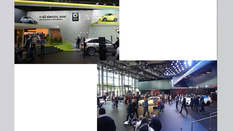 von 46: Auch bei Mercedes-Benz blieb die Mittelkürzung nicht ohne sichtbare Wirkung. Wer erinnert sich nicht an die "gigantische Exhibition 2017"? Sie setzte Maßstäbe. Diese setzte man heuer im Forum der Festhalle mit der Modellpräsentation von MB und Smart abgespeckt fort. Mit Vision EQS, Plug-in-Hybride der A- und B-Klasse, GLC e 4Matic, GLE 350 der 4MATIC u.a. Als erster Hersteller steigt Smart komplett auf Elektrobetrieb um, hier mit dem Fortwo und Forfour.