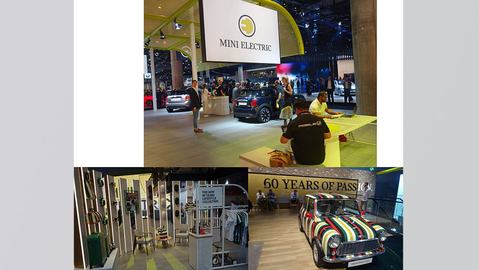 von 46: Der Mini Cooper SE ist für Kurzstrecken angelegt. Reichweite zwischen 235 und 270 Kilometer. Basispreis 32.500 Euro. Lieferbar ab März 2020. im ersten Stock des originellen Standes traf man auf 60 Jahre "Mini". Der Mini-Auftritt gefiel durch seine originellen Gestaltungselemente und durch die Kombination der Farben.