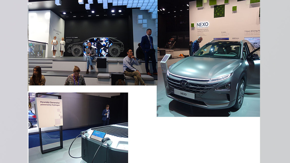 von 46: Hyundai präsentiert auf der IAA sichtbare Glanzpunkte. Der Ioniq ist das einzige Modell mit drei elektrischen Antriebsvarianten. Der Nexo zeigt das serielle Brennstoffzellen-SUV mit 750 Kilometer Reichweite und fünf Minuten Tankdauer.