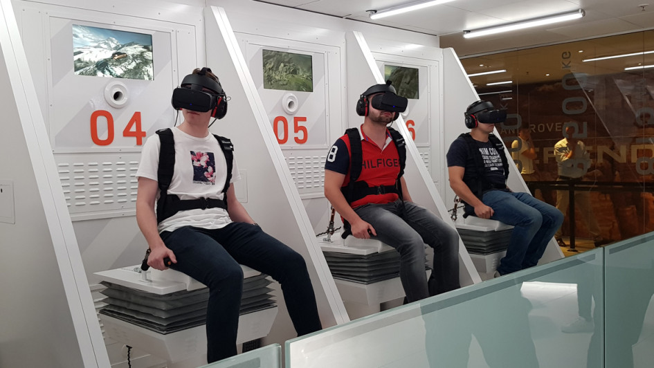 von 11: Sieht komisch aus, ist aber die Zukunft. Ohne "Virtual Reality" geht heute nichts mehr auf einer Messe. War früher ein Fahrsimulator das höchste aller Gefühle, sind heute VR-Brillen gefragt - wie hier in der "Land Rover Defender Virtual Reality Experience Zone". Es ist wohl nur eine Frage der Zeit, bis man sein Wunschauto virtuell konfigurieren und darin dann auch einsteigen kann.