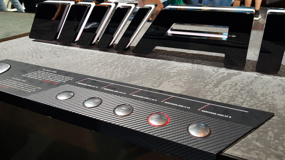von 11: Ein Tresen, fünf Knöpfe, kein Auto - diese unauffällige Installation auf dem Mercedes-Stand hatte es eigentlich schwer, umringt von lauter hochgezüchteten PS-Boliden. Eigentlich. Denn was aus der kleinen eingebauten Box kam, war feinster AMG-Auspuff- und Motoren-Sound. Ein wahres Klangerlebnis für jeden Autoliebhaber. Und so standen sie da, vor allem männliche Besucher jeden Alters, und lauschten der temperamentvollen Komposition mit einem breiten Grinsen im Gesicht.