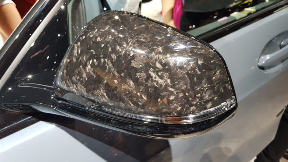 von 11: Da haben ja etliche Besucher ihre Fingerabdrücke hinterlassen, könnte man auf den ersten Blick meinen. Angesichts der Massen auf der IAA durchaus denkbar. Doch der Seitenspiegel dieses BMW 1ers besteht aus Forged Carbon und ist sündhaft teuer. Ob für diese Art von Kohlefaser, die aussieht wie eine schmutzige Oberfläche, Kunden wirklich viel Geld ausgeben wollen, bleibt abzuwarten.