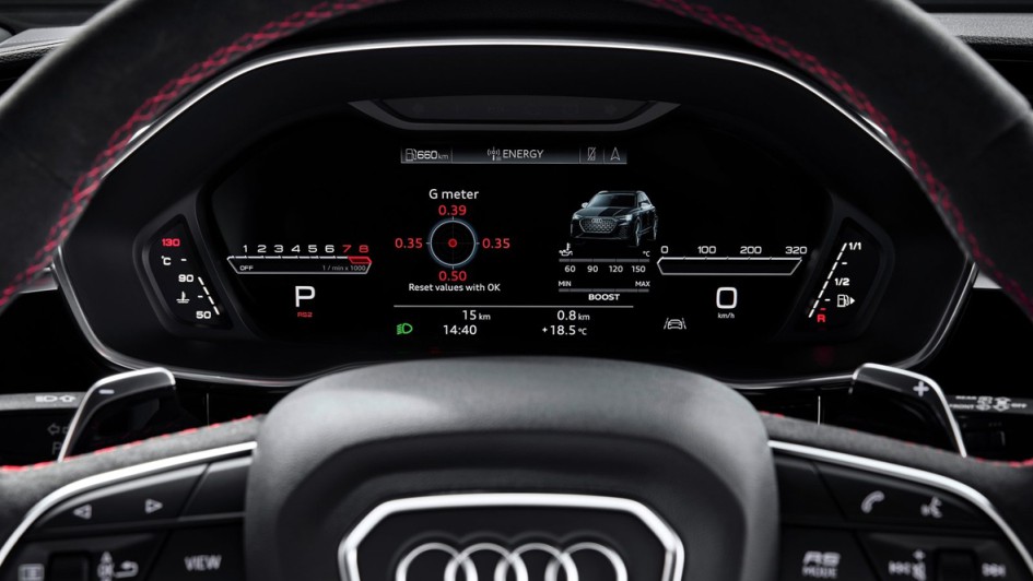 von 13: Im Innenraum trimmen die Spezialisten von Audi Sport das Cockpit gezielt in Richtung Vorlieben der RS-Kundschaft. So gibt es zum Beispiel das optional erhältliche Virtual Cockpit Plus mit Schaltblitz-Darstellung.