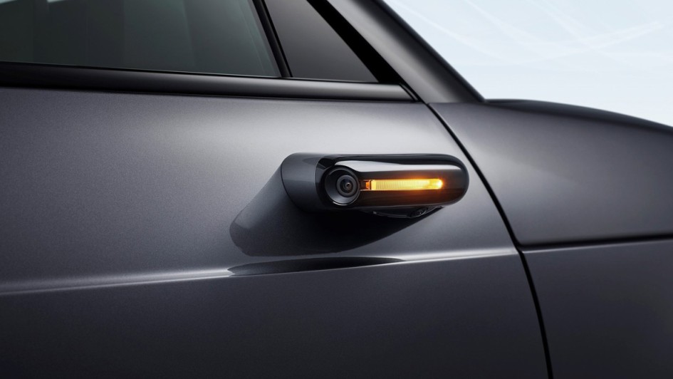 von 14: Wie man es eigentlich nur von Concept Cars kennt, verzichtet das Auto darüber hinaus auf Außenspiegel. Auf den Türschultern finden sich stattdessen kleine, mit Kameras bestückte Finnen. "Virtueller Außenspiegel" heißt diese erstmals im Pkw als Serienausstattung verwendete Lösung, bei der Displays an den äußeren Enden des Armaturenbretts das rückwärtige Verkehrsgeschehen zeigen.