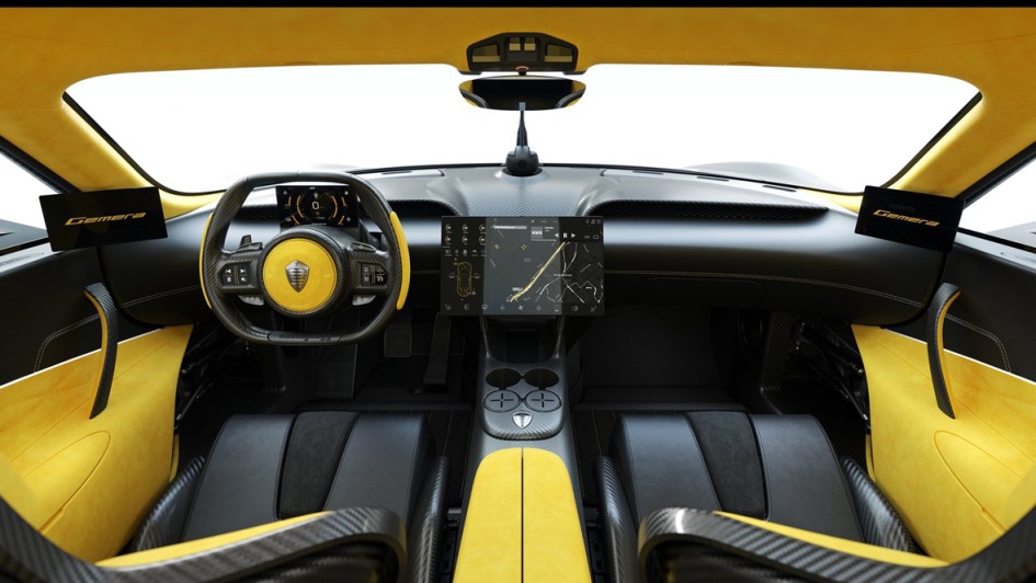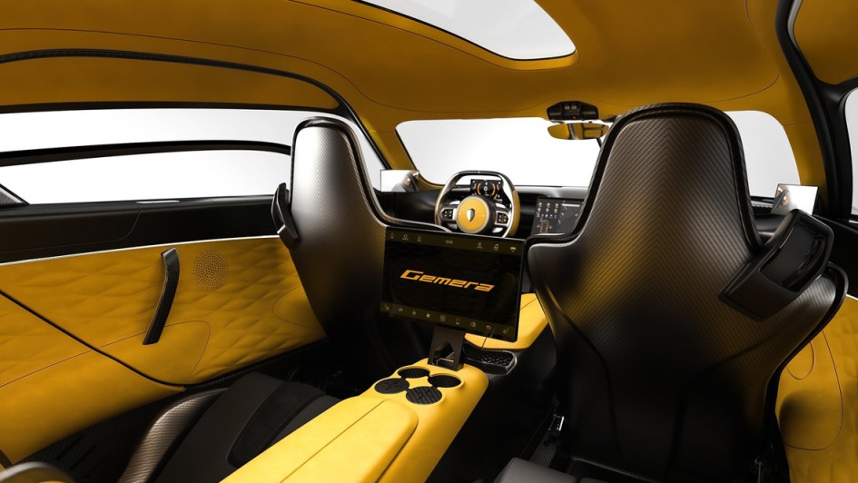 von 10: Der Innenraum des Gemera empfängt seine Gäste mit viel Leder und Carbon. Neben dem Display für fahrrelevante Informationen gibt es noch einen großen Infotainmenttouchscreen sowie zwei Displays für die virtuellen Außenspiegel.