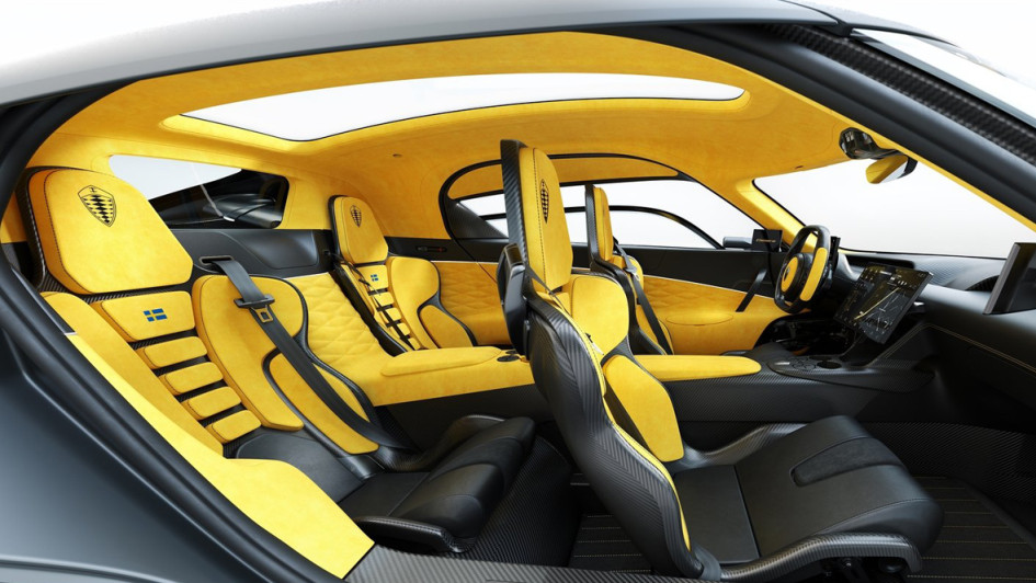 von 10: Erstmals gibt es einen Koenigsegg mit vier Sitzgelegenheiten. Die vier sportlich konturierten Einzelsitze sind mittig durch einen den gesamten Innenraum durchlaufenden Mitteltunnel getrennt.