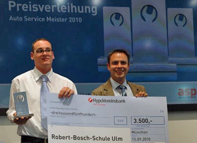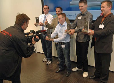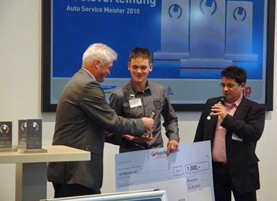 von 8: Danny Sauerbrey (Bildmitte) lernte sein Handwerk am BTZ Rohr im Bezirk der HWK Südthüringen. Der 23-Jährige trumpfte beim ASM zweimal hintereinander mit bemerkenswertem Branchenwissen auf. Beim ASM 2009 erreichte er als Kfz-Meisterschüler den zweiten Rang. In diesem Jahr besuchte er den Meisterkurs für Karosserie- und Fahrzeugbauer und belegte beim ASM den dritten Platz. Pokal und Scheck überreichte ihm Klaus Jürgensen vom TÜV Nord (im Bild links). asp-Chefredakteur Frank Schlieben hielt die Lobrede (re.).