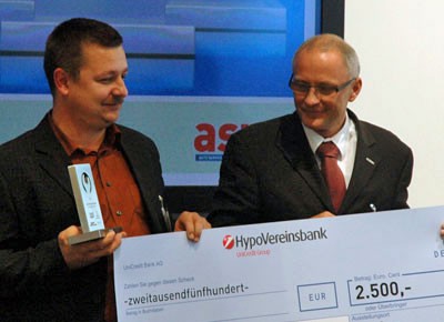 von 8: Die Meisterklasse 2010 der RBS Ulm war nach Frankfurt gekommen, um den Preis in Empfang zunehmen. Im Bild Klassensprecher Thomas Schifferens und Klassenleiter Thomas Psotka.