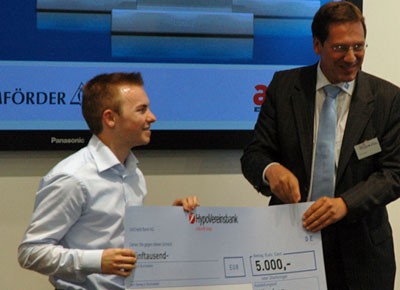 von 8: Matthias Strung kommt von der Gewinner-Schule aus Ulm. Der Erstplazierte erhält den Siegerscheck von Ulrich Walz vom Hauptsponsor ZF Services (re.). Die Schweinfurter sind von Beginn an beim ASM an Bord.
