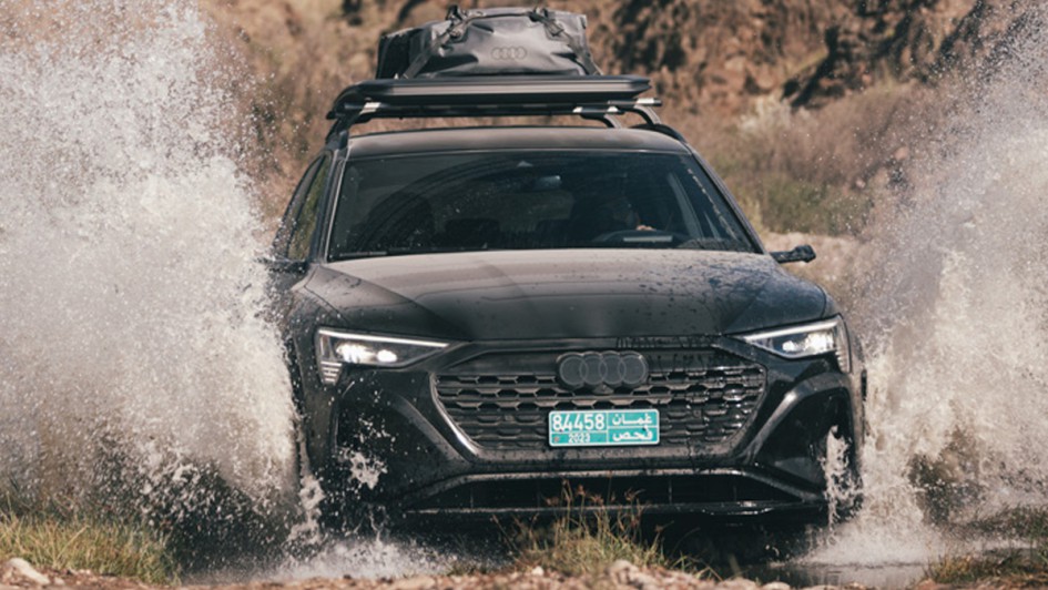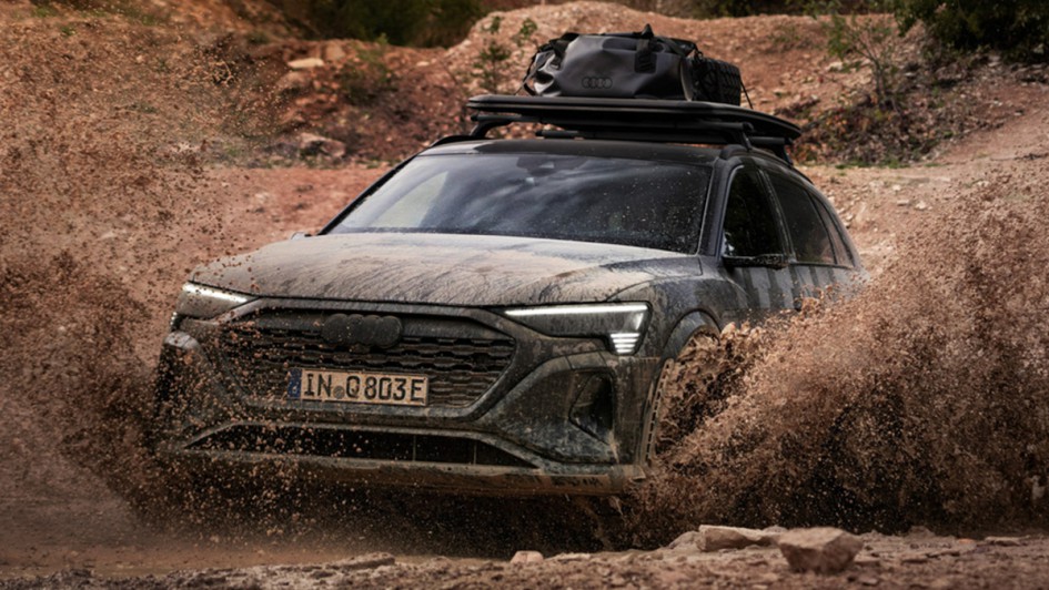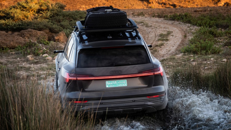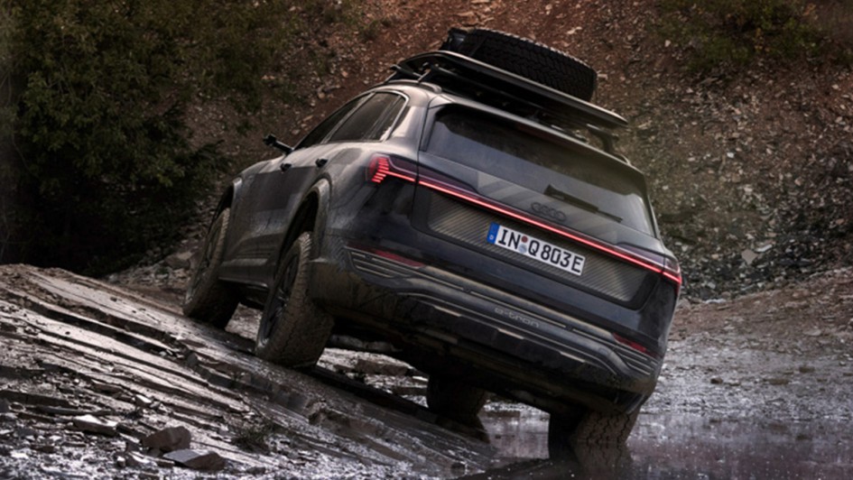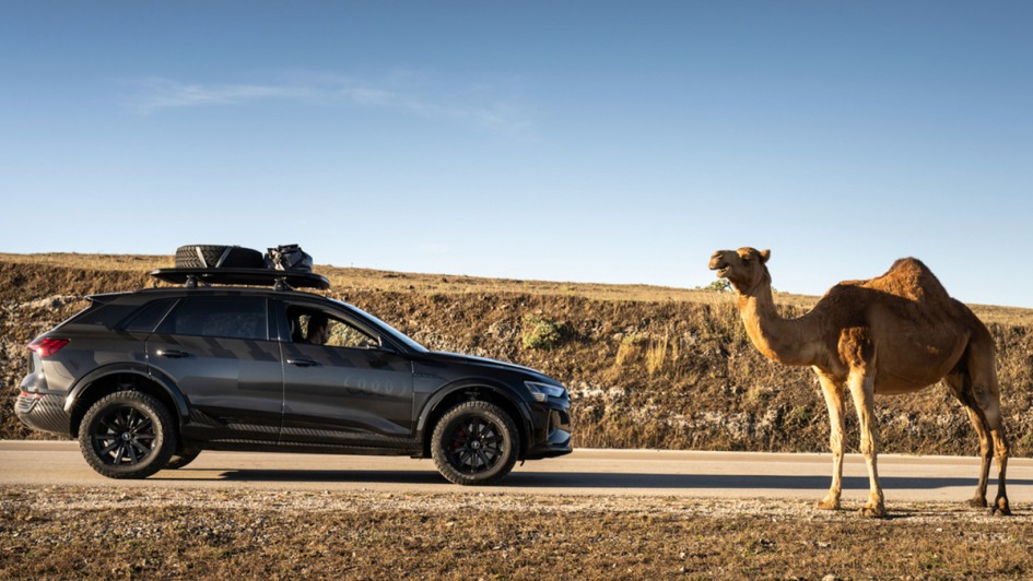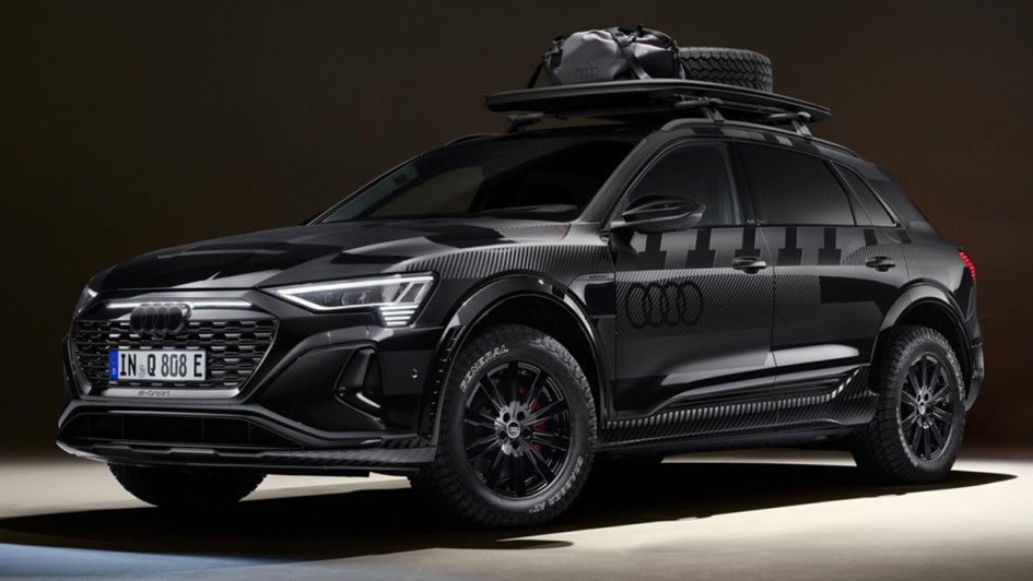 von 10: Das höhergelegte Chassis und die optional erhältliche Folierung des Sondermodells erinnern bereits von außen an den für die Rallye Dakar konzipierten RS Q e-tron mit elektrischem Antrieb und Energiewandler.