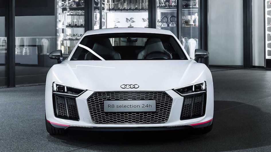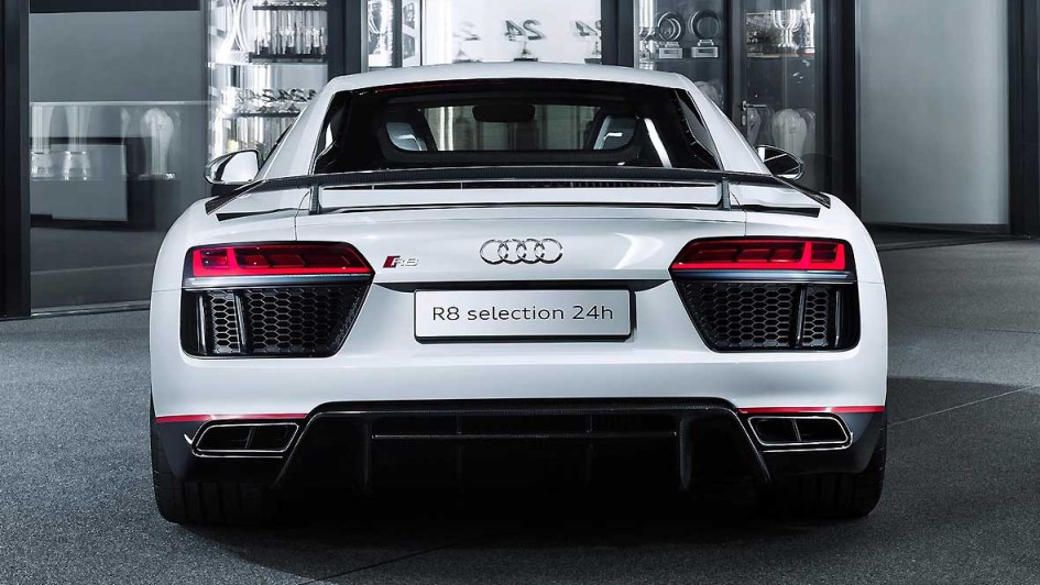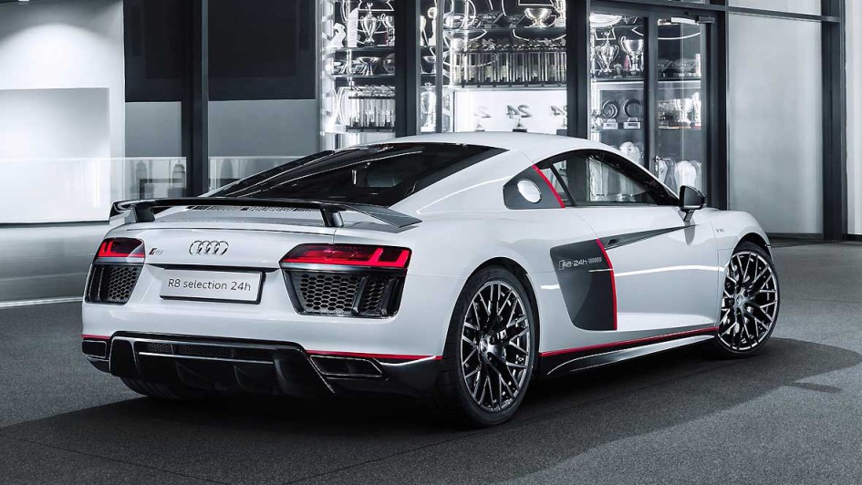 von 5: Äußeres Erkennungszeichen ist eine Dreifarblackierung in Grau-Schwarz-Rot, ein Heckflügel und ein Diffusor aus glanzlackiertem Carbon sowie Sideblades mit "R8 24h-Schriftzug".