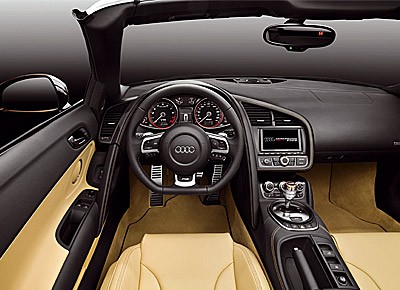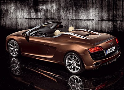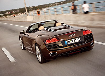 von 10: Der Audi R8 Spyder ist ein offener Zweisitzer. Er kommt im ersten Quartal 2010 in den Handel. Der Verkauf startet zum Grundpreis von 156.400 Euro in diesen Tagen. Das Kraftwerk des Hochleistungssportwagens ist ein Zehnzylinder mit Aluminium-Kurbelgehäuse, der 530 Nm maximales Drehmoment auf die Kurbelwelle stemmt und eine Höchstleistung von 386 kW / 525 PS erreicht.