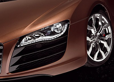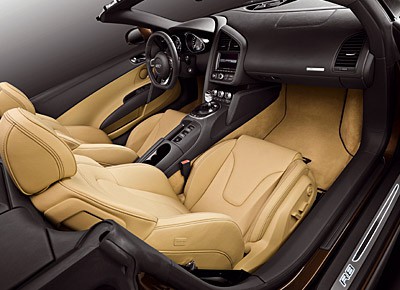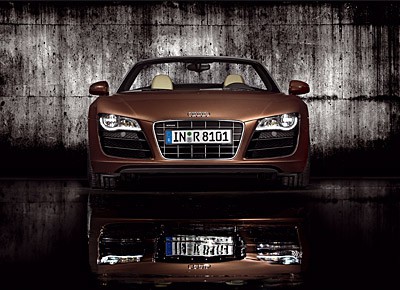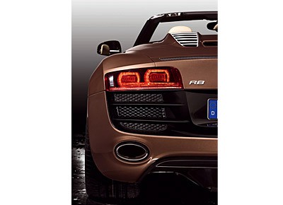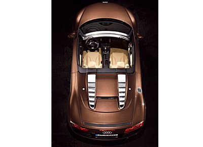von 10: Den Normverbrauch gibt Audi in Kombination mit der serienmäßigen Sechsgang-Handschaltung mit 14,9 Liter an – mit dem automatisierten Sechsganggetriebe "R tronic" sollen es 13,9 Liter sein. Beim Design grenzt sich der Spyder klar vom Coupé ab: So tragen etwa die Lufteinlässe im Bug und die Lippe der Frontschürze hochglänzendes Schwarz.