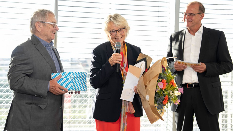 von 23: Mit einem herzlichen Dank für "30 Jahre AUTOHAUS" ehrte Ralph M. Meunzel seine Kollegin Doris Plate. Aus den Händen von Klaus-Dieter Breitschwert erhielt die Vollblutjournalistin einen "Bayerischen Löwen".